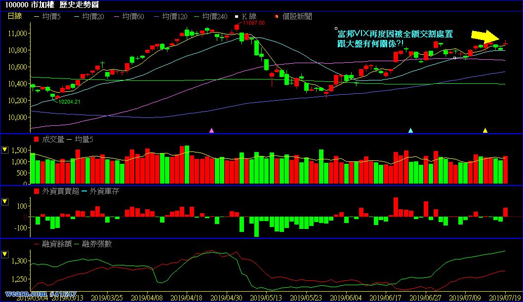 上次今年4月底很巧合的富邦VIX被全額交割之後,很巧合的加權指數從高檔進行了一波700點修正